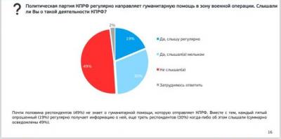 При этом примечательно, что помощь парламентской оппозиции особенно выделили люди старше 60 лет, например помощь КПРФ увидели 10% опрошенных, а СРЗП и ЛДПР – по 2%, «других партий» – 3%. Кроме того, в этой же возрастной группе старше 60 лет и группе среднего возраста 45–59 лет 8% опрошенных отметили, что все партии помогают в равной степени. Тогда как в более возрастных группах до 45 лет помощь всех партий увидели только 3% опрошенных. О том, что КПРФ занимается гуманитарной помощью, слышали около 50%, из них «регулярно слышали» 19%, а «мельком» – 30%.