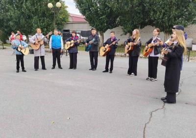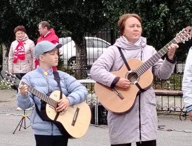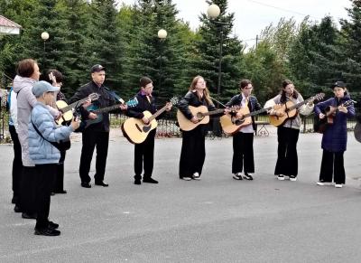 Ансамбль гитаристов под собственное сопровождение исполнил советские песни, посвященные героям Великой Отечественной, зрители подпевали исполнителям песен.
