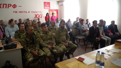 Перед началом – традиционная церемония вручения наград и подарков бойцам артиллерийского дивизиона 30-го артиллерийского полка, а также многодетным семьям. Три бойца получили партийные билеты и встали на учет в Железнодорожное местное отделение КПРФ. Аплодисментами участники заседания проводили награжденных.