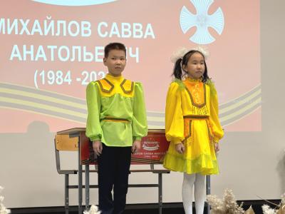Сайыына и Дамир перед коллективом школы дали торжественную клятву: «Чтить героев нашей Родины! Быть патриотами России! Быть честными и справедливыми! Быть образцами в учёбе и дисциплине! С гордостью сидеть за Партой Героя Саввы Михайлова!»