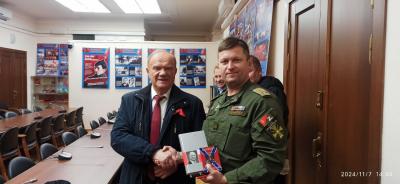 В перерыве между митингом и круглым столом удалось пообщаться с нашим лидером Геннадием Андреевичем Зюгановым, который передал памятный подарок для одного краснодонского кузнеца за его вклад в увековечивание истории о войне на Донбассе в кованных из снарядов поделках и даже памятниках.