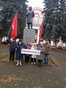 Электростальские коммунисты 7 ноября с флагами проехали по городу, возложили цветы к памятнику В.И. Ленина и К. Маркса.