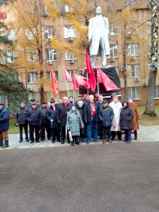 Перед товарищами с поздравлением выступил: секретарь Коломенского ГК КПРФ Михаил Столяров: «Историки до сих пор не могут прийти к единому мнению относительно оценки октябрьских событий 1917 года. Однако большинство людей советского периода с добрыми чувствами вспоминают своё счастливое детство. Советская власть это истинно бесплатная медицина, бесплатное образование, социальная защита от государства. Беда в том, что все хорошее, что надо было взять в будущее, власти отвергли, а стали брать чуждое и вовсе неприемлемо для России, для народов населяющих нашу страну. Коммунисты сегодня носители справедливости в нашем обществе». Коммунисты обменялись своими воспоминаниями. Вспомнили годы празднования 7 ноября во времена Советской власти. Вычеркнуть из памяти все достижения Советского периода просто невозможно. В память великой даты коммунисты возложили цветы к памятнику В.И. Ленина. Слава Великой Октябрьской социалистической революции! С праздником дорогие, товарищи, день 7 ноября - это наш с вами праздник!