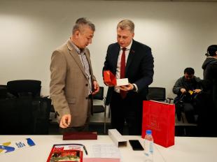 В заключение встречи Александр Ивачёв вручил руководителю Департамента новостей CGTV тов. Хо Жаокун подарки от Председателя ЦК КПРФ Геннадия Андреевича Зюганова. Сотрудники телеканала получили также журналы с подобной информацией о медийных ресурсах Компартии и фирменные сувениры с логотипом КПРФ.