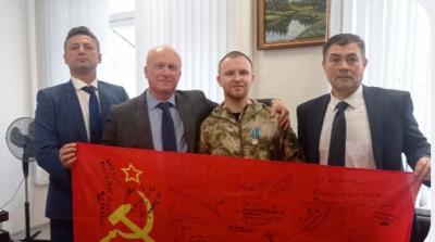 «Уверен, что это Красное знамя будет водружено над очередным освобожденным населенным пунктом сражающегося Донбасса» - сказал Координатор Королёвского отделения «Союза советских офицеров» С. Новрузов.