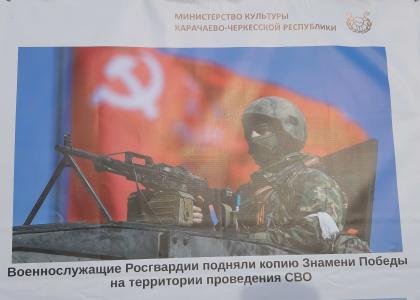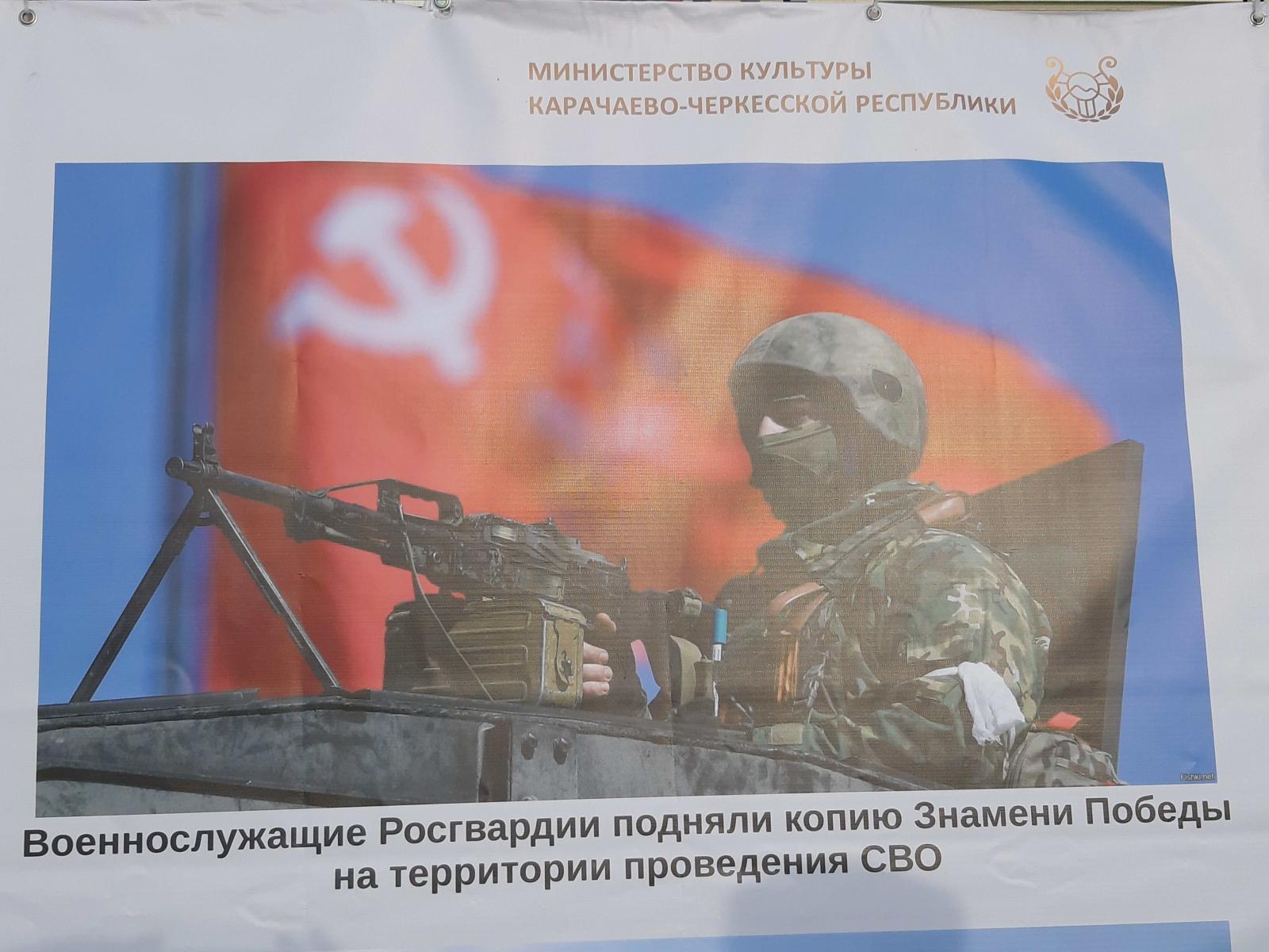 На одном из огромных плакатов, подготовленных Министерством культуры КЧР и расположенных здесь же, на выставке техники в Черкесске, имеется фотография воина на фоне Красного Знамени и такие слова: «Военнослужащие Росгвардии подняли копию Знамени Победы на территории СВО». Сразу вспомнились слова Главы КЧР Рашида Бориспиевича Темрезова в связи с предстоящим в 2025 году празднованием 200-летия города Черкесска. Р.Б. Темрезов заявил, что главным символом празднования юбилея города станет знамя Великой Победы. Об этом он сообщил в Telegram-канале.