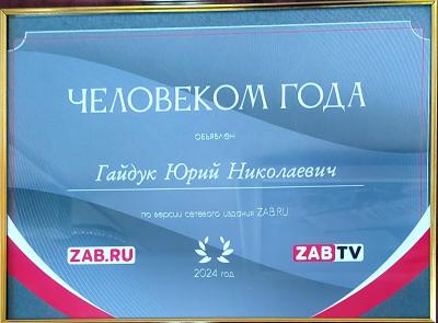 Сетевое издание ZAB.RU по итогам голосования объявило «Человеком года» первого секретаря Забайкальского краевого комитета КПРФ, члена Центрального Комитета КПРФ, руководителя фракции КПРФ в Законодательном собрании Забайкальского края Юрия Гайдука.