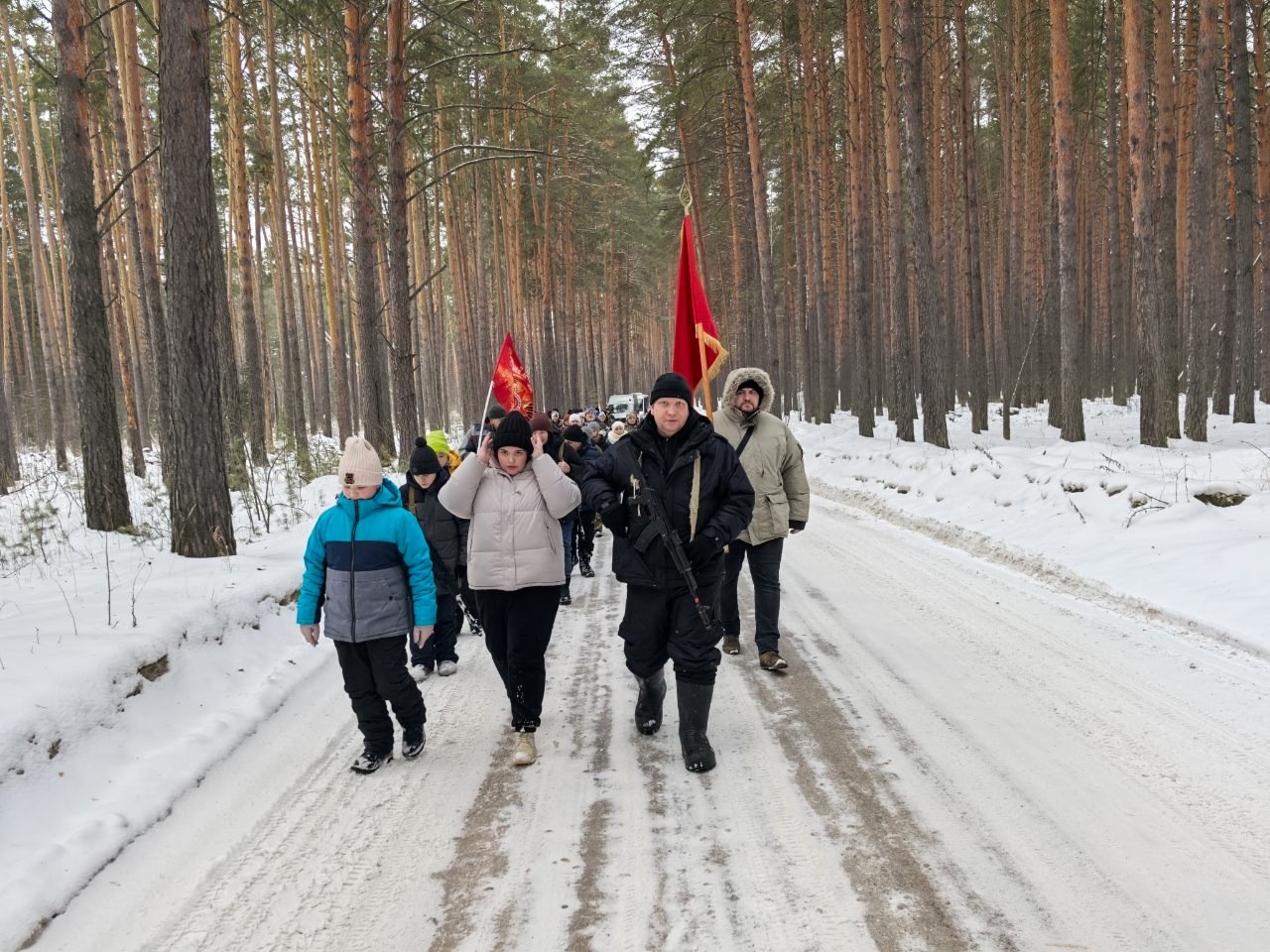 Дети и их родители следовали по лесному массиву.
