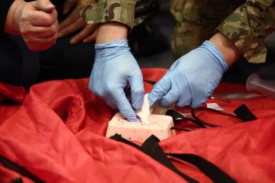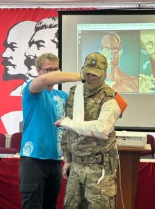 В этот раз занятия проводил военный медик с позывным «Пуск» и хирург с позывным «Нукид». В рамках образовательной программы, специально для слушателей второго курса, медик «Пуск» продемонстрировал на себе установку капельницы.
