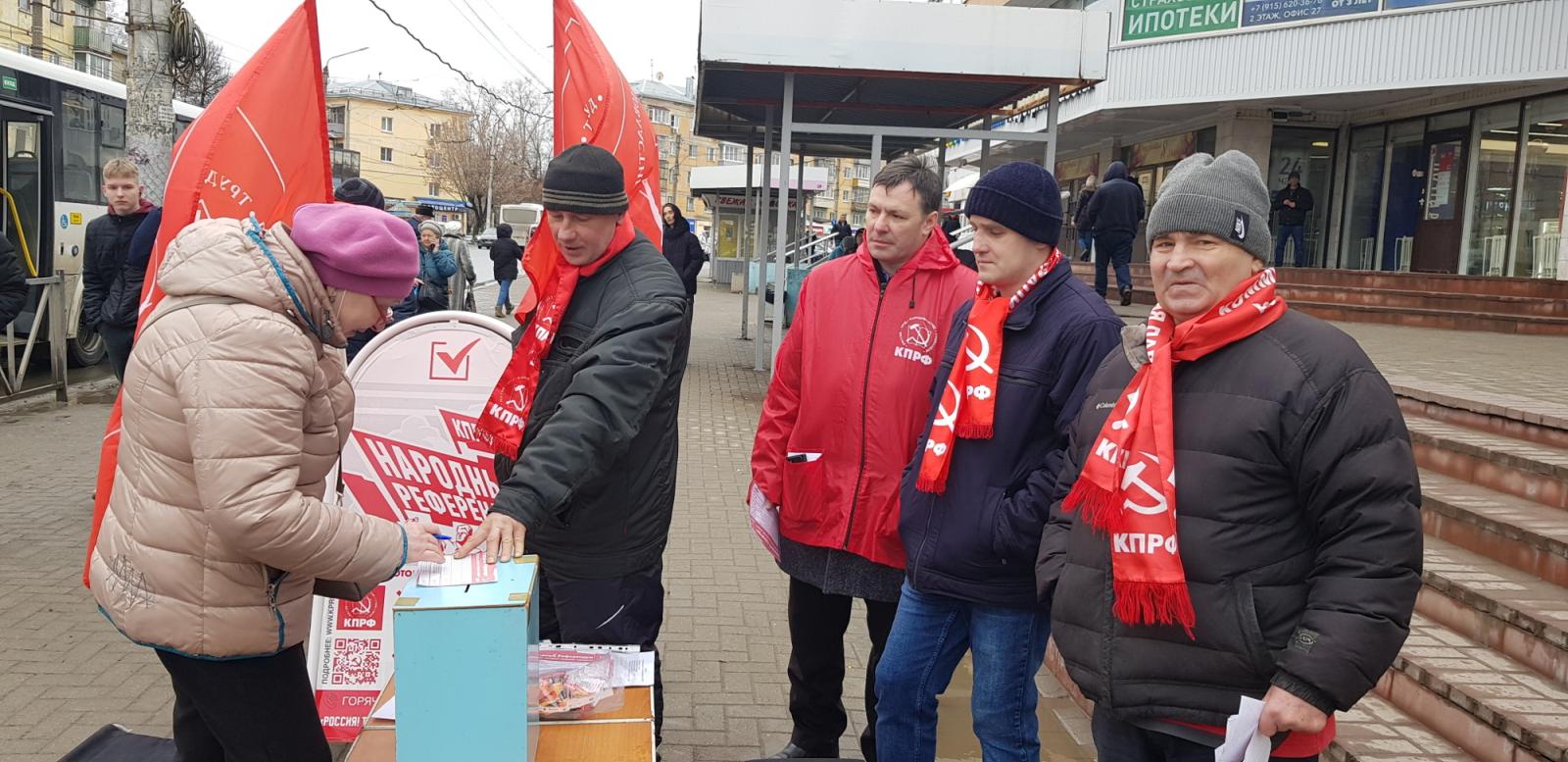 Рязанские коммунисты продолжают работу по проведению в области Народного референдума КПРФ. Жители могут проголосовать по вынесенным на него вопросам как в помещениях КПРФ, так и на уличных пунктах, по телефону или через партийный сайт. Эта работа проводится как областном центре – г.Рязани, так и в районах области, чтобы предоставить гражданам возможность выразить мнение по ключевым социально-экономическим проблемам и напрямую повлиять на решения, затрагивающие их права.