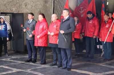 У подножия монумента «Родина-мать зовет!» собрались сталинградские коммунисты, ветераны, представители общественных организаций «Дети войны», ЛКСМ РФ, а также гости города — делегации астраханских и калмыцких коммунистов.