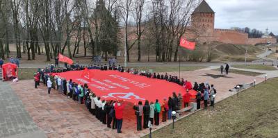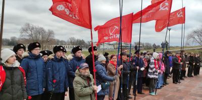 На торжественном митинге у монумента воинов-освободителей Новгорода возле древних стен Кремля собрались не только коммунисты и комсомольцы, но и ветераны, юнармейцы, воспитанники Клуба юных моряков, представители волонтерских движений, школьники.