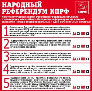 Голосование проходит, как правило, и по окончании встреч с депутатами-коммунистами, которые информируют избирателей об акции КПРФ. Особенно активно идет работа в Городовиковском местном отделении партии, возглавляемом депутатом РМО Людмилой Балаклеец. Бюллетени референдума распространяются на городском рынке в так называемые «базарные дни», посетителей ждут и в офисе райкома партии, рядом с которым установлен стенд с информацией о Народном референдуме КПРФ.