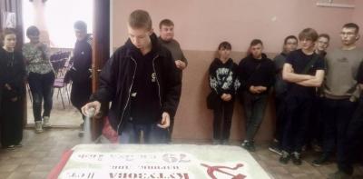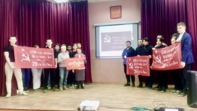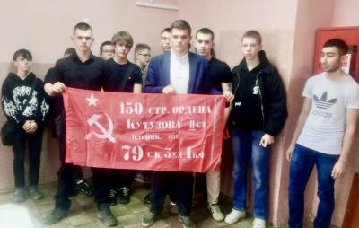 По окончании мероприятия студенты колледжа вместе в коммунистами своими руками с помощью трафарета и краски изготовили копии Знамени Победы, которые будут вручены нашим бойцам, защищающим Русский мир на Донбассе.