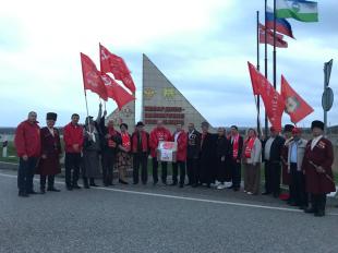 Затем краснознаменная автоколонна отправилась на границу со Ставропольским краем, где увеличенная копия Красного Знамени Победы была торжественно передана коммунистам братского Ставропольского края.
