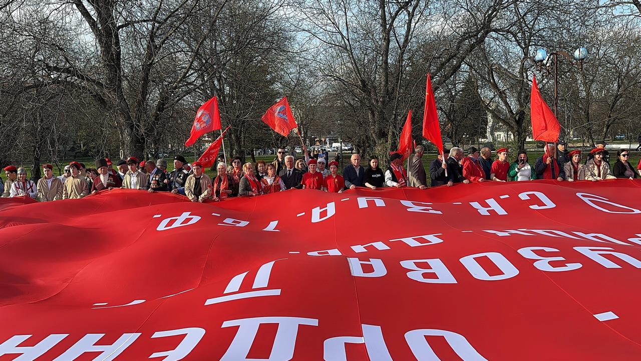 Торжественная церемония марша-эстафеты – митинг и развертывание 20-метровой копии Знамени Победы – началась в 16 часов дня в центре Нальчика, у стелы «Нальчик – Город воинской славы». Здесь, на площади в Ореховой роще, вместе с коммунистами собрались участники СВО, воины-интернационалисты, представители общественных организаций республики, юные ленинцы, юнармейцы, активисты патриотических организаций.