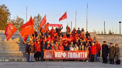 В ожидании знамени, которое к нам приехало с родины Владимира Ленина, дети войны, коммунисты, комсомольцы, представители лево-патриотических организаций и активные сторонники КПРФ возложили цветы к монументу героям в Парке Победы, а затем направились на набережную Автозаводского района. Эту патриотическую акцию весьма позитивно встретили тольяттинцы, отдыхающие на набережной: все с удовольствием фотографировали Знамя Победы и пели песни военных лет.