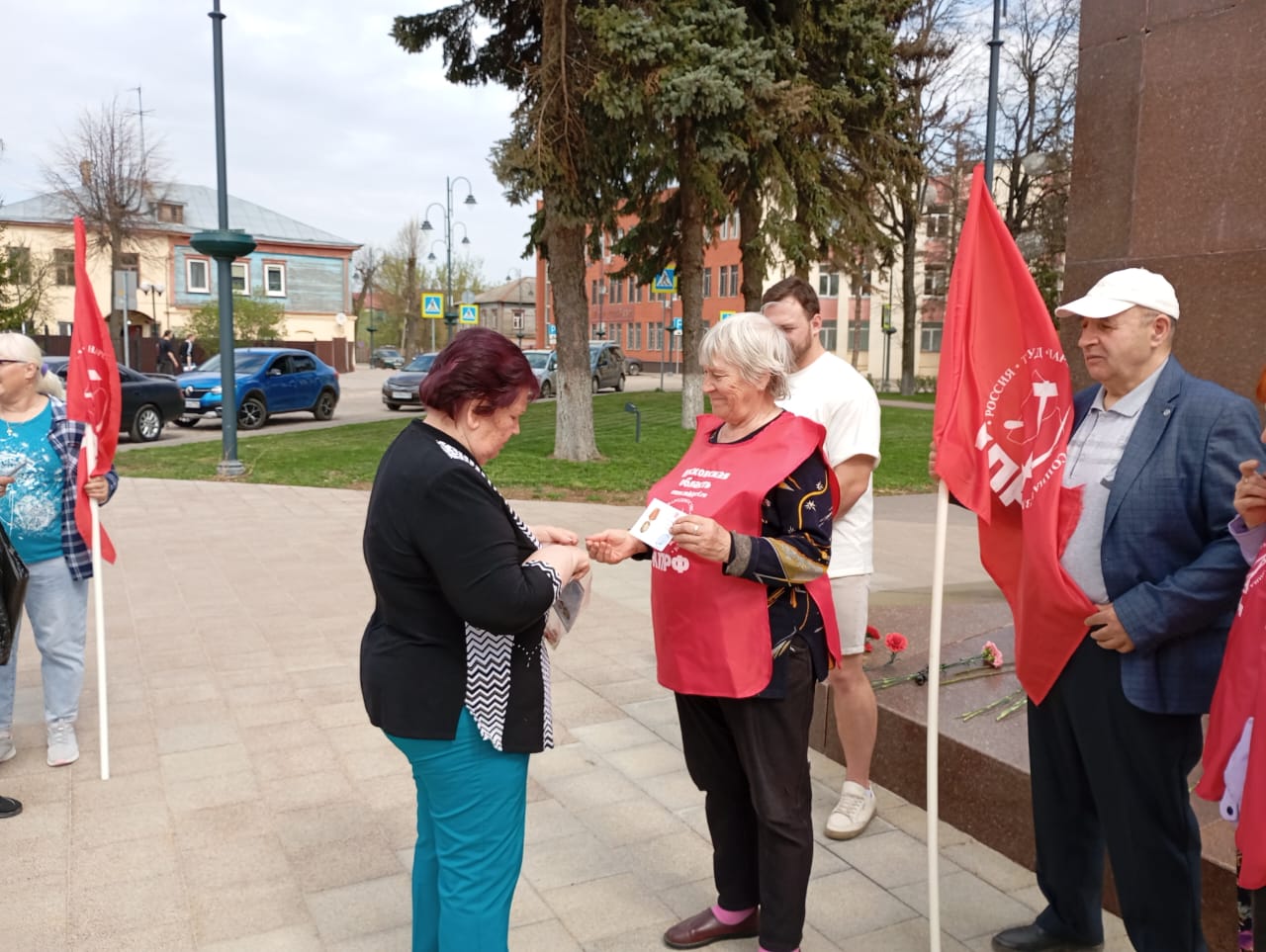 Лотошинские коммунисты перед началом праздничного мероприятия вышли с цветами, плакатами В.И. Ленина в руках. Со знаменем, яркими шарфами и красными жилетами КПРФ.