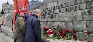Завершив автопробег, свердловские коммунисты и сторонники левых идей возложили цветы к памятнику основателю первого в мире государства трудящихся.