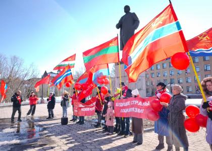 Участники стали собираться с утра у здания бывшего окружкома КПСС. Играла праздничная музыка, разворачивали флаги КПРФ и всех Союзных республик СССР, раздавали шарики.