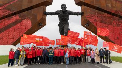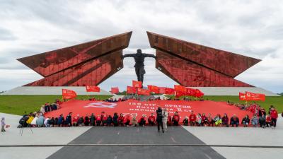 В Курской области, на священной земле, состоялся торжественный этап Всероссийской акции патриотического марафона «Наша Великая Победа». Коммунисты и комсомольцы региона, школьники, военнослужащие и жители области приняли участие в торжественном развертывании копии Знамени Победы на мемориальном комплексе «Курская битва» у памятника солдату в Понырях.