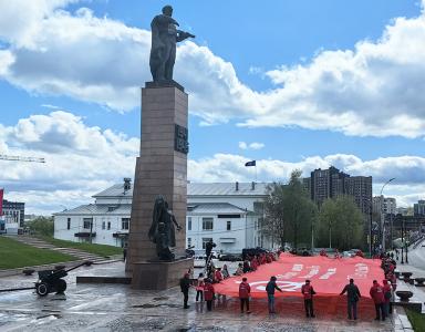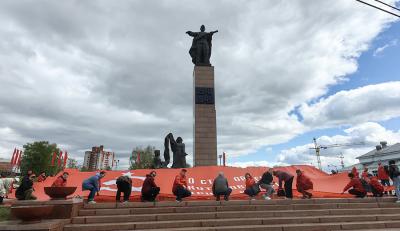 По завершению выступлений участники акции возложили красные розы к памятнику Героям фронта и тыла, после чего они развернули гигантское полотнище – увеличенную копию Знамени Победы площадью 200 квадратных метров – символа мужества и доблести советского народа.
