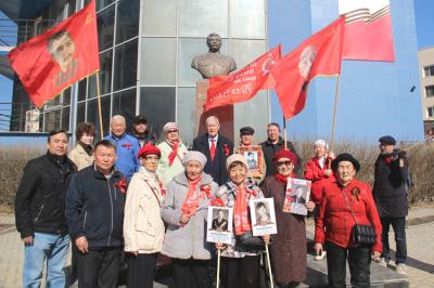 По дороге на площадь Победы коммунисты возложили живые цветы к памятнику первого секретаря Якутского обкома КПСС в 1965 — 1982 годах фронтовика Гавриила Чиряева.