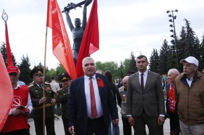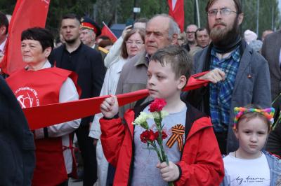 В Омске коммунисты и комсомольцы развернули многометровую копию Знамени Победы в парке им. 30-летия Победы. Там прошло торжественное возложение венка и цветов к Вечному Огню и памятнику Матери солдата.