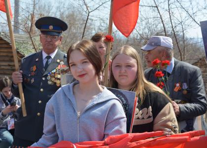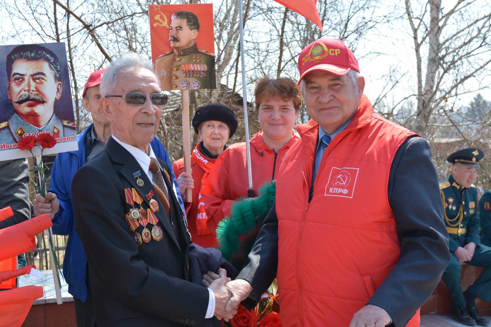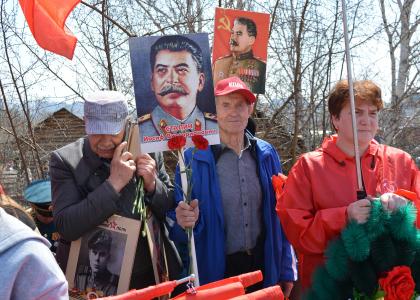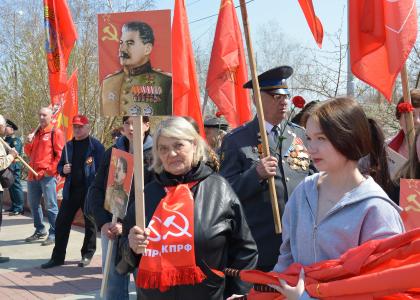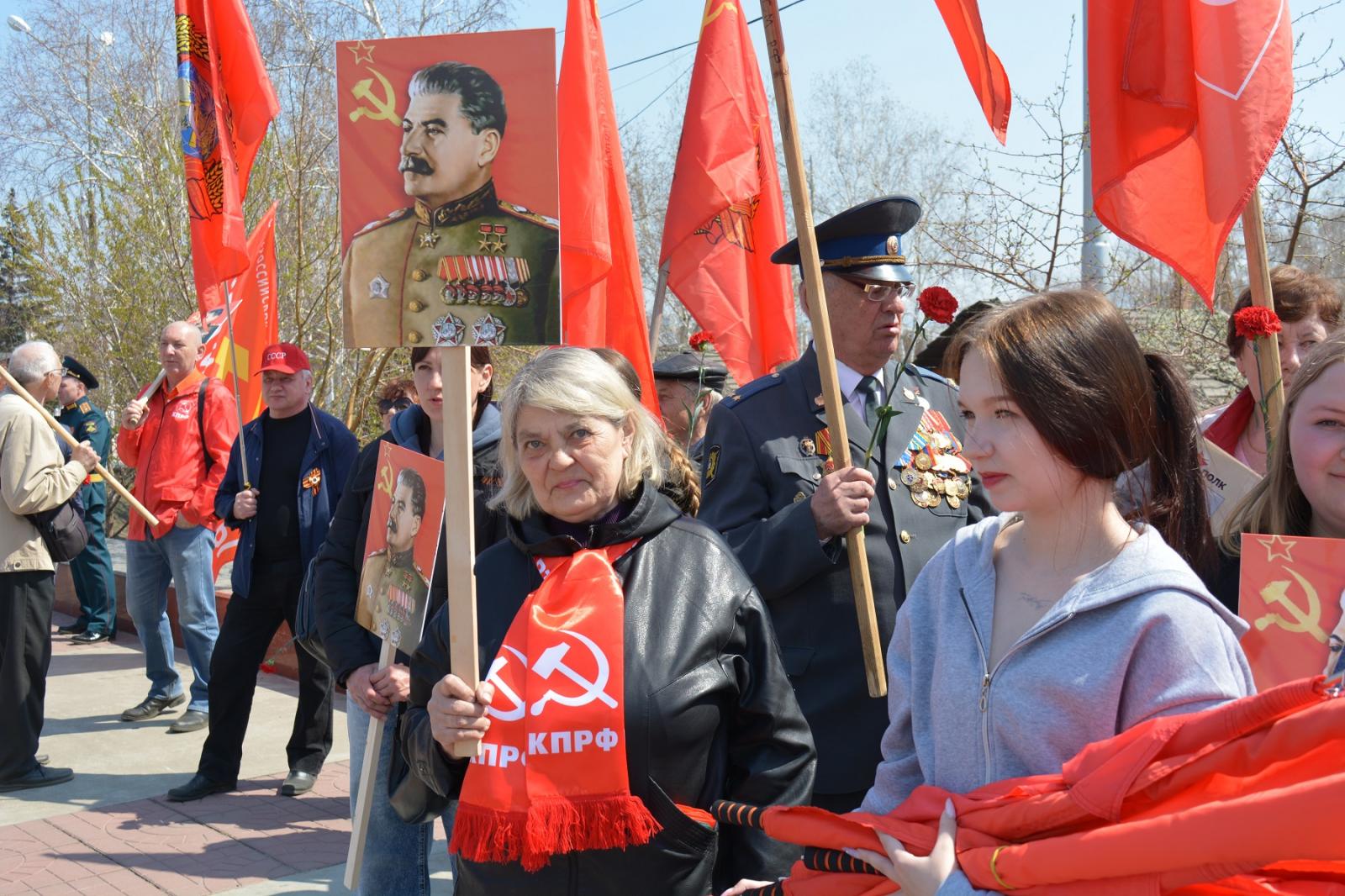 Ряды партийцев и их единомышленников украшали гордо развивающиеся на ветру красные копии Знамени Победы и флаги Советского Союза, в руках – алые гвоздики и портреты генералиссимуса СССР Иосифа Сталина, под чьим руководством советский народ одержал победу над фашистской Германией в Великой Отечественной войне.