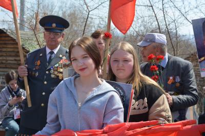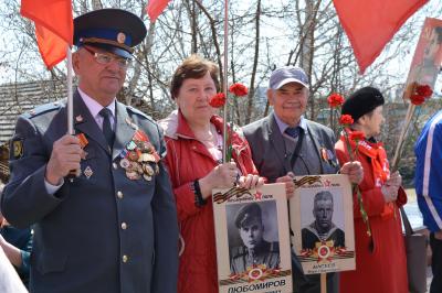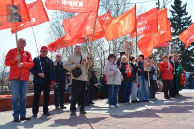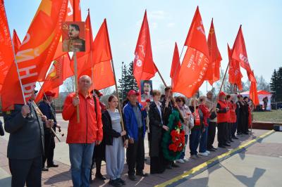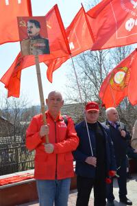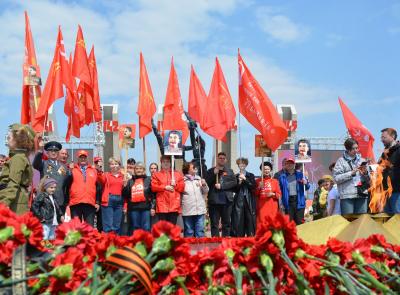 Ряды партийцев и их единомышленников украшали гордо развивающиеся на ветру красные копии Знамени Победы и флаги Советского Союза, в руках – алые гвоздики и портреты генералиссимуса СССР Иосифа Сталина, под чьим руководством советский народ одержал победу над фашистской Германией в Великой Отечественной войне.