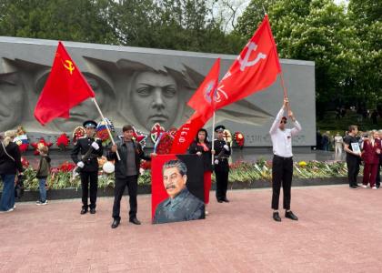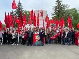 После военного парада на площади Ленина в общий поток людей в числе первых влилась красная колонна КПРФ. Впереди - копия Знамени Победы, за ней - портрет И.В. Сталина, следом - стройные шеренги с флагами.