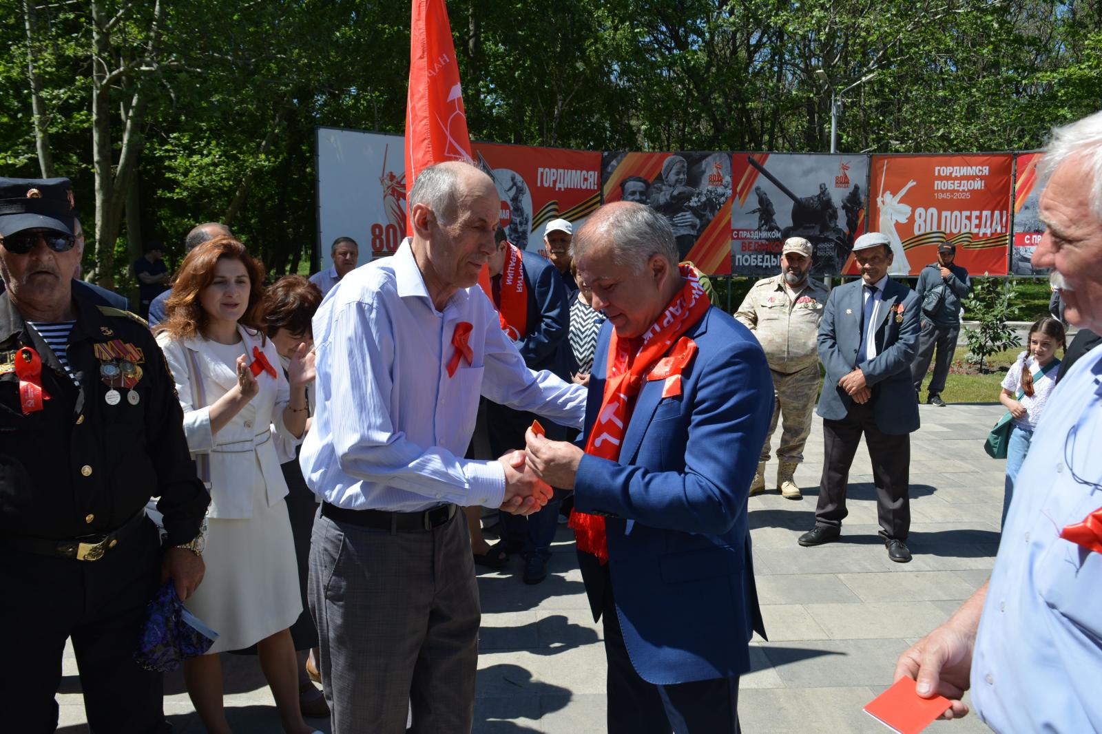 По маршруту колонны у памятника Героя Советского Союза Магомета Гаджиева коммунисты возложили цветы. Далее, цветы возложили к Вечному огню, почтив память героев и выразив свою благодарность им за их подвиг. С поздравительной речью выступил первый секретарь Дагестанского рескома КПРФ Самир Абдулхаликов, отметив небывалый героизм и самоотверженность тех, кто сражался за нашу свободу. Резолюцию, которую собравшиеся приняли единогласно, зачитала комсомолка Екатерина Бирюкова. В торжественной обстановке были вручены юбилейные медали "80 лет Великой Победы" активным коммунистам г.Махачкалы.