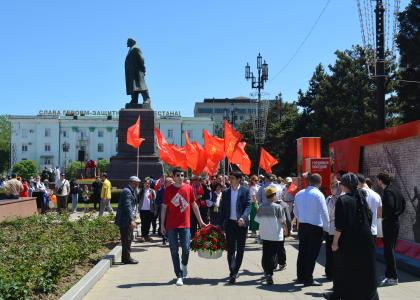 Колонна во главе с первым секретарем Дагестанского республиканского отделения КПРФ, руководителем фракции КПРФ в Народном Собрании РД Самиром Абдулхаликовым двинулась с центральной площади города им. В.И.Ленина по улице Героя Советского Союза Магомета Гаджиева в парк им.Ленинского Комсомола к Мемориалу воинам, павшим в Великой Отечественной войне.