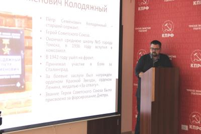 Секретарь по идеологии Томского обкома КПРФ А.А. Давыдов рассказал об участии комсомольцев Томской области в Великой Отечественной войне». Были среди них Герои Советского Союза, как Иван Черных и И.С. Колодяжный, были и доблестные труженики тыла. Один факт: в первые же дни войны 12 тысяч томских комсомольцев ушли добровольцами на фронт.