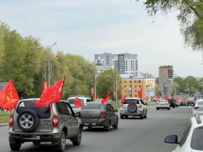 В автоколонне с красными знамёнами коммунисты проехали по центральным улицам города — копия Знамени Победы преодолела несколько десятков километров.