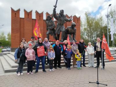 С победными Красными Знаменами коммунисты прошествовали по городу и возложили цветы к стелле «Скорбящая Мать» в память о погибших долгопрудненцах, а затем провели автопробег и возложили венок к Памятнику павшим воинам в микрорайоне Хлебниково.