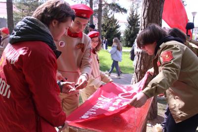 В дни празднования 80-летия Великой Победы, комсомольцы и пионеры, провели акцию по сохранению исторической правды и организовали раздачу красных бантиков и ленточек – символов нашей Победы.