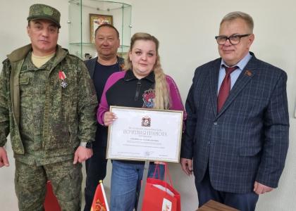 Почетным знаком «За труды» награжден военный комиссар городского округа Домодедово и Ленинского городского округа, полковник Михаил Гарданов. Почетную грамоту Мособлдумы получила Анастасия Комарова. Благодарностями Думы награждены сотрудники военкомата: участник СВО, награжденный двумя Орденами Мужества и медалью «Воинская доблесть» капитан Александр Музенитов и Наталья Даурцева.