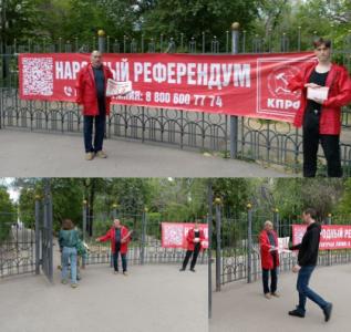 Коммунисты и активисты Октябрьского райкома КПРФ г. Саратова провели акцию на территории Детского парка. Перед входом в парк был вывешен баннер по голосованию за Народный референдум рядом с которым активисты раздавали специальный выпуск «Народный референдум КПРФ» и предлагали всем желающим проголосовать по вопросам Народного референдума любым удобным для них способом: по телефону горячей линии, с помощью QR-кода, либо опустив бюллетень в передвижную урну для голосования, которая работала на территории парка.