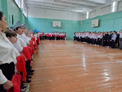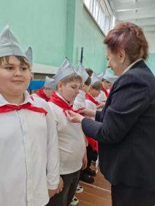 На торжественной линейке красные галстуки повязали 110 ребятам. Тамара Петровна передала вновь вступившим в красногалстучные отряды поздравление от Председателя ЦК КПРФ Геннадия Зюганова, и вручила каждому пионеру памятные сувениры.