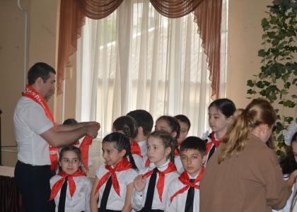 Далее гости и учителя школы повязали юным пионерам красные галстуки и вручили им сладкие подарки. В завершение праздничного мероприятия были сделаны фото на память.