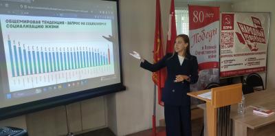 Кратко и ёмко она охарактеризовала социальные и экономические процессы в мире и в нашей стране, обратив внимание на движение общества к социалистическим идеям на фоне глобальных экономических кризисов и власти олигархата.