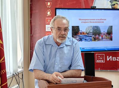 Со вторым докладом «История кладбища старых большевиков» к собравшимся обратился Главный редактор газеты «Слово Правды», член Бюро Ивановского обкома КПРФ С.В. Каргапольцев. Сергей Витальевич рассказал о создании и истории уникального ивановского некрополя, уделив особое внимание личностям захороненных здесь 27 видных представителей партии большевиков, внёсших значительный вклад в борьбу за советскую власть, в том числе и создателей Первого Совета.