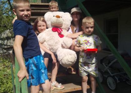 Когда коммунисты приехали в дом этой семьи, малышня сразу облепила гостей. Огромного плюшевого медведя немедленно занесли в дом, где он нашел своё место среди других игрушек ребят.
