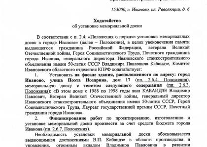 – Истинный патриотизм, глубокая убеждённость, смелые поступки – всё это говорит о ярком жизненном пути участника Великой Отечественной войны, выдающегося руководителя и настоящего коммуниста Владимира Павловича Кабаидзе, – отмечает лидер ивановских коммунистов Александр Бойков. – Вся его жизнь была наполнена трудом во имя Великой страны и ради успешного развития ставшей для него родной Ивановской области. Поэтому его жизнь и его дела поучительны для многих поколений.