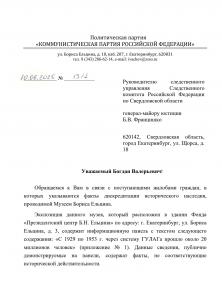 Коммунисты просят Следственный комитет РФ провести проверку в отношении деятельности Музея Бориса Ельцина, дать правовую оценку распространению недостоверной информации и, при наличии нарушений, принять меры в защиту граждан.