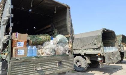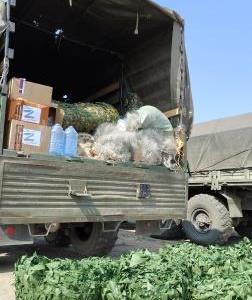 Было передано: 7 тонн бутилированной воды (по 5 литров), фрукты и соки в стеклянных трёхлитровых банках – 252 шт., товаров медицинского назначения 45 ящиков, 37 маскировочных сетей, 1500 метров специальных сетей и 3 тонны продуктов питания длительного хранения.