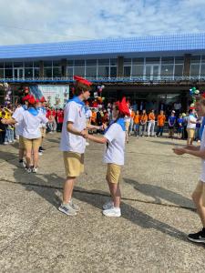 После вручения участникам лагеря спортивных подарков, старшие вожатые повязали на память почётным гостям лагеря «Красная Гвоздика» - участникам торжественной линейки - галстуки с эмблемой международного лагеря «Артек».