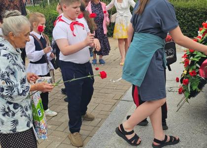 После этого новгородские пионеры и комсомольцы вместе с «Детьми войны» прошли на возложение цветов к памятнику пионеру-герою Лёни Голикову в центре Великого Новгорода. Другими участниками церемонии стали руководитель «Музея истории партизанского движения на Новгородской земле» Лия Хусаиновна Калинина и её воспитанники, которые также пришли почтить память Лёни Голикова.