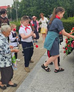 После этого новгородские пионеры и комсомольцы вместе с «Детьми войны» прошли на возложение цветов к памятнику пионеру-герою Лёни Голикову в центре Великого Новгорода. Другими участниками церемонии стали руководитель «Музея истории партизанского движения на Новгородской земле» Лия Хусаиновна Калинина и её воспитанники, которые также пришли почтить память Лёни Голикова.